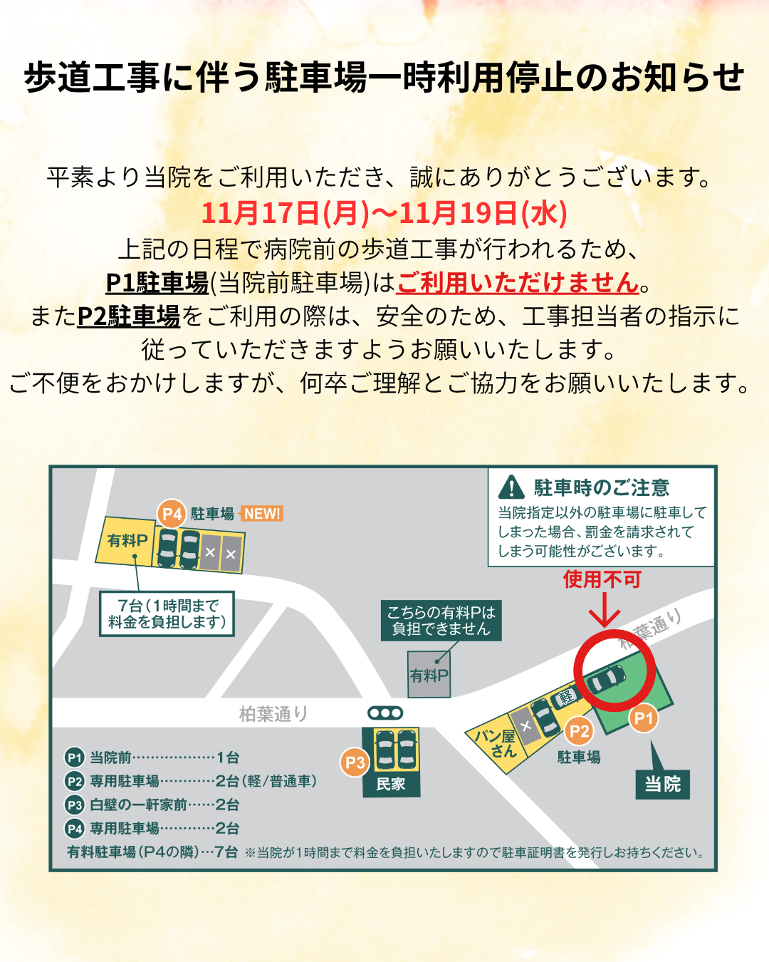 歩道工事に伴う駐車場一時利用停止のお知らせ 2025.11.13 Tweet Share Hatena Pocket RSS feedly Pin it この記事のタイトルとURLをコピーする 2026年当院オリジナルカレンダー写真募集 前の記事 歩道工事一部内容変更のお知らせ 次の記事