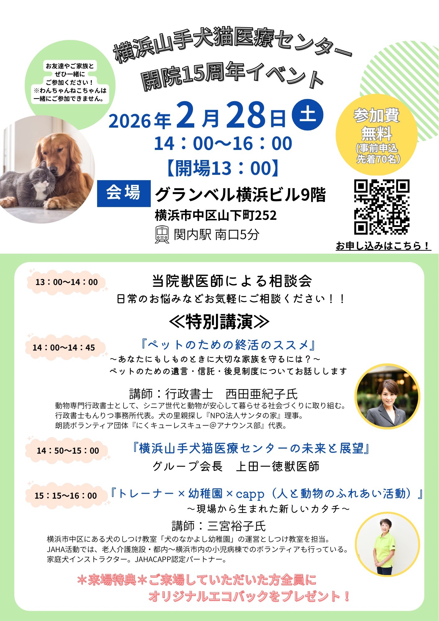 開院15周年記念イベントのお知らせ 2026.02.12 Tweet Share Hatena Pocket RSS feedly Pin it この記事のタイトルとURLをコピーする 平素より当院をご利用いただき、誠にありがとうございます。 おかげさまで当院は開院15周年を迎えました。 日頃の感謝を込めて、特別講演会および当院獣医師による相談コーナーを開催いたします。 ご来場の皆さまには、当院ロゴ入りオリジナルエコバッグをご用意しております。 本イベントは事前申し込み制です。定員になり次第締め切りとなりますので、お早めにお申し込みください。 皆さまのご参加を心よりお待ちしております。 エピレス・コンセーブ・ゾニサミド 価格変更のお知らせ 前の記事